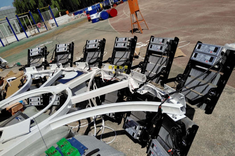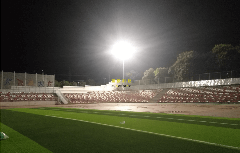 工程,操場四角各安裝一套18米升降高桿燈,每套燈配置12盞300W大功率LED(飛利浦芯片,明緯電源),夜間體育場整體平均亮度為26-35Lux,夜晚如白晝,調(diào)試效果深受校方認(rèn)可。